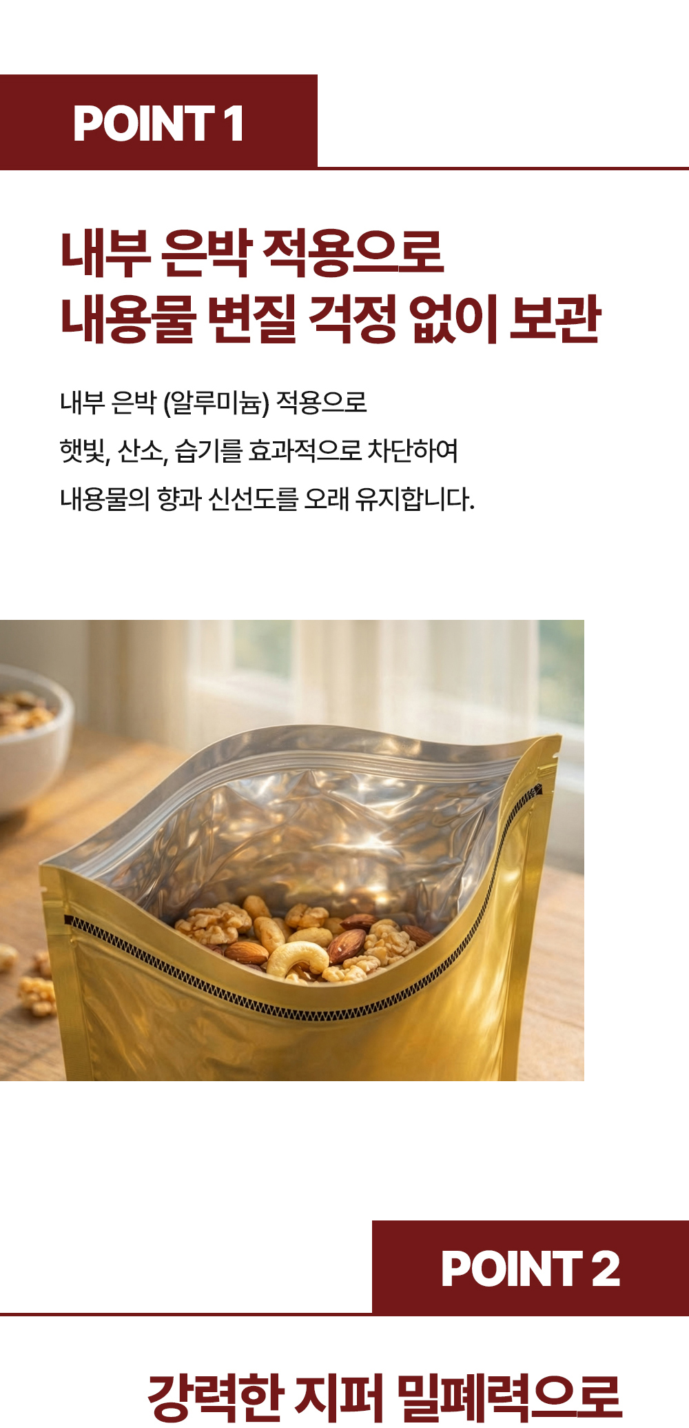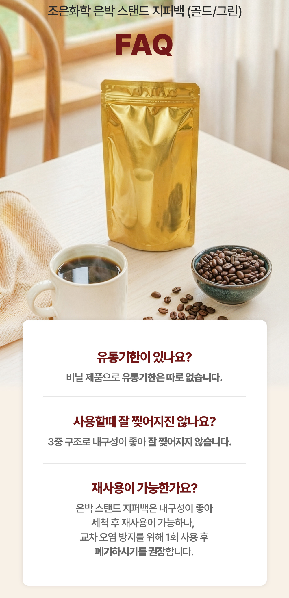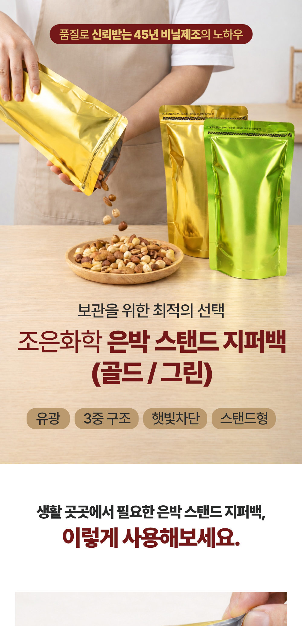 • 소개 은박 삼방 스탠드 지퍼백은 PET + AL + LLDPE 3중 구조로 제작되어 햇빛, 산소, 습기로부터 내용물을 보호하여 향과 신선도를 오래 유지하도록 설계된 프리미엄 포장 제품 입니다.