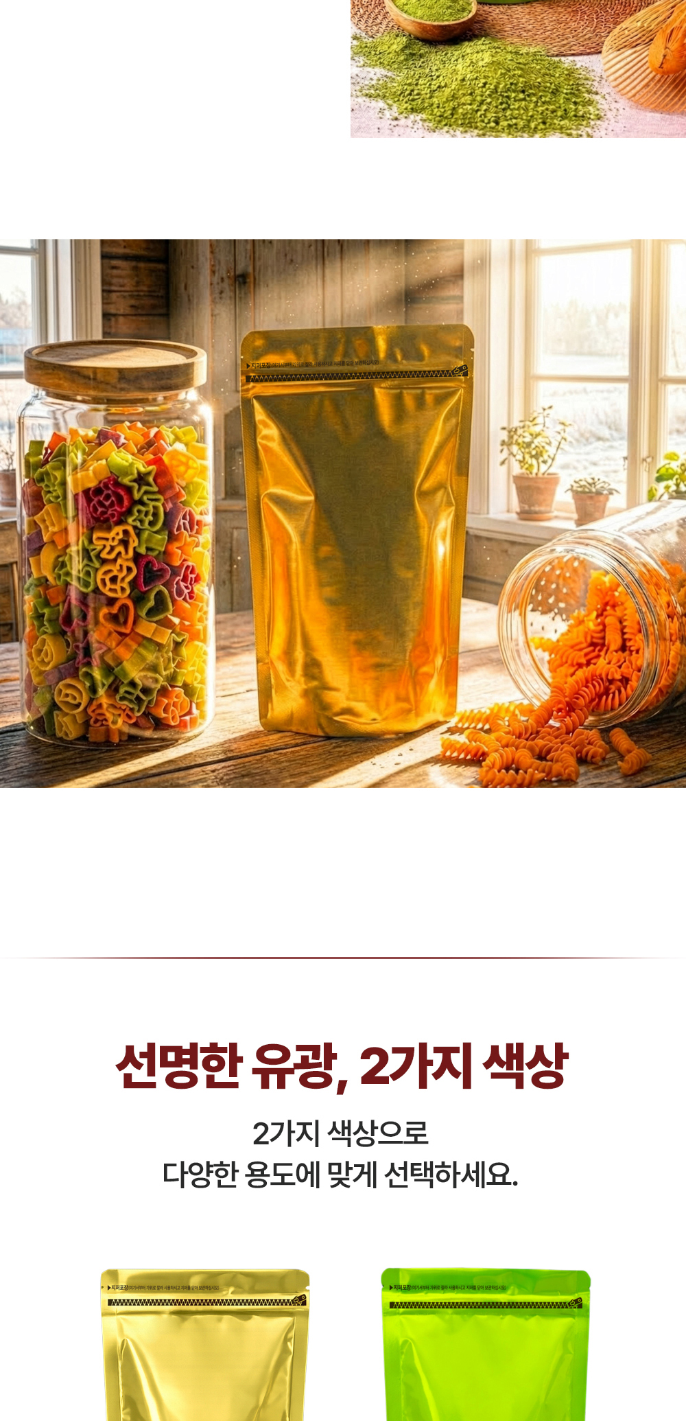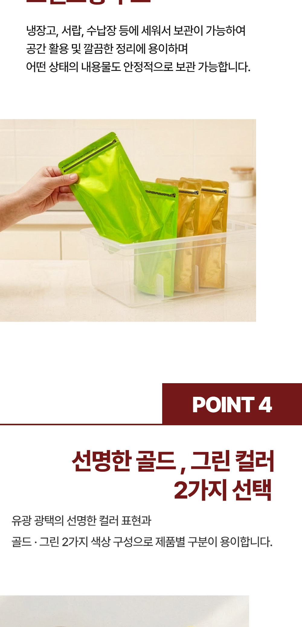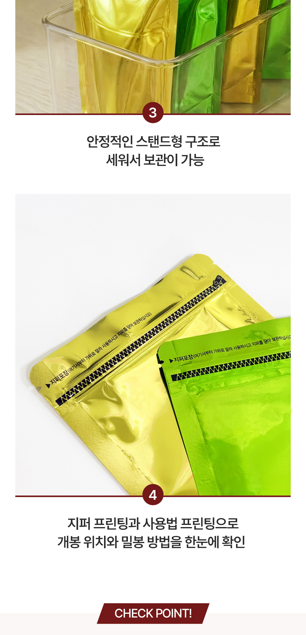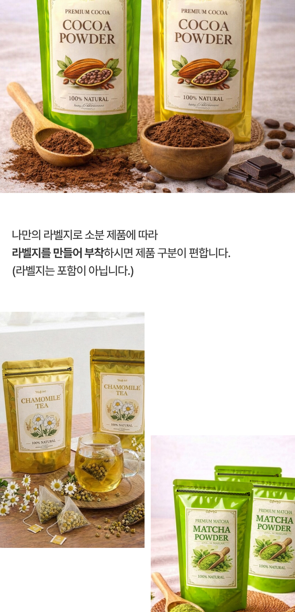 지퍼백과 스탠드형 구조를 적용하여 안정적인 보관과 편리한 사용이 가능하며, 티백차, 원두, 간식, 견과류, 분말류 등 다양한 포장 용도로 활용 할수 있습니다.