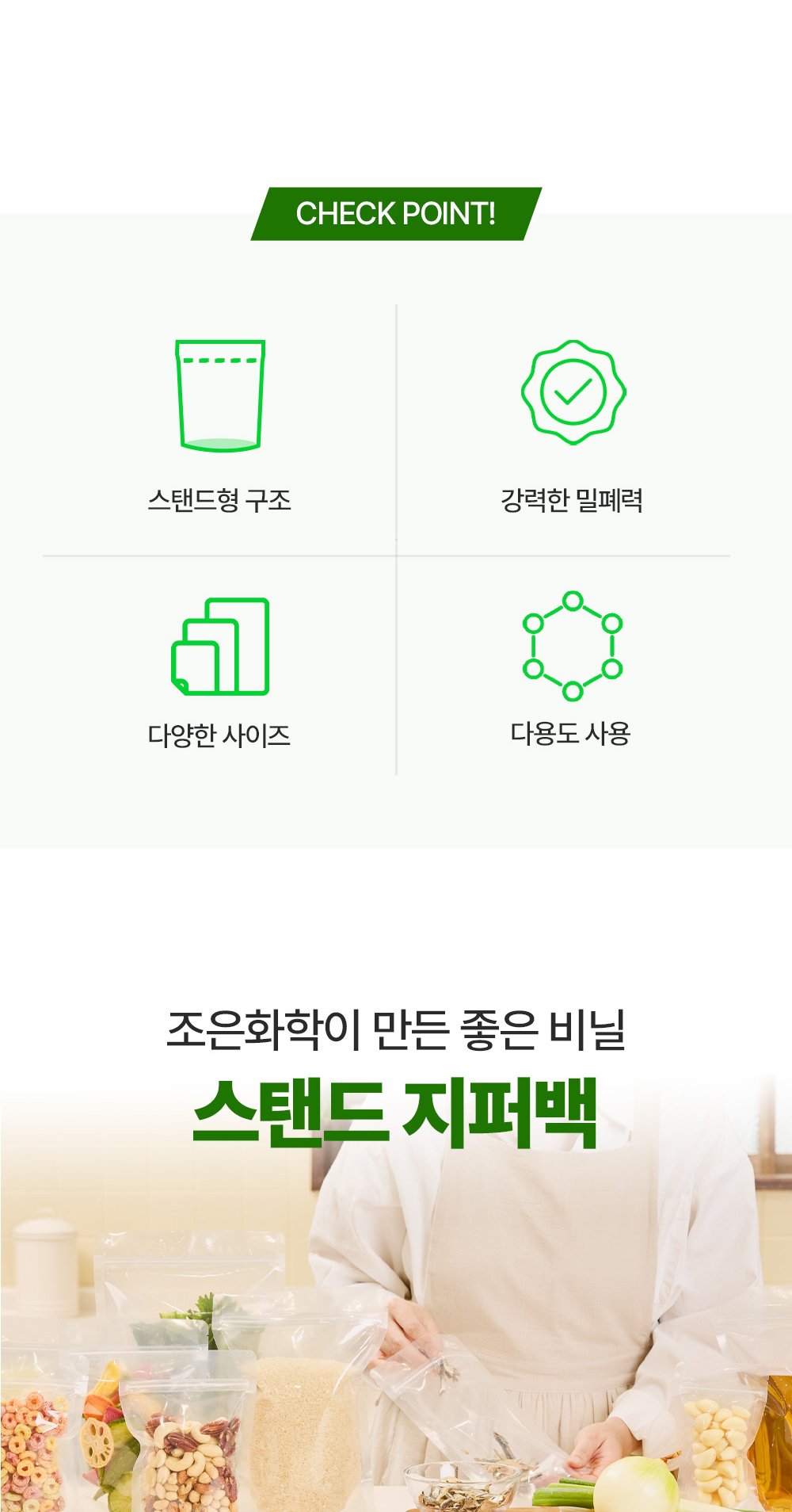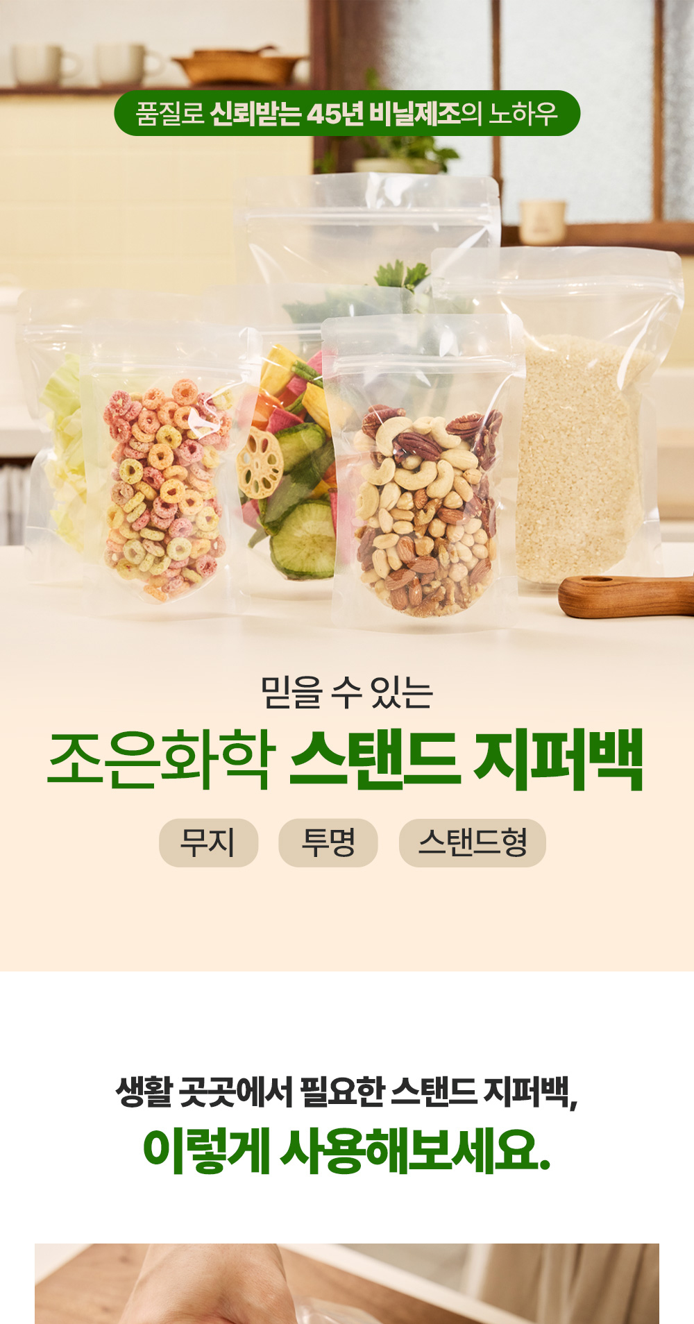 투명 스탠드 지퍼백은 내용물 확인이 용이한 투명 재질로 제작된 포장용 지퍼백으로, 자립형 구조를 적용해 진열과 보관이 편리한 제품입니다.