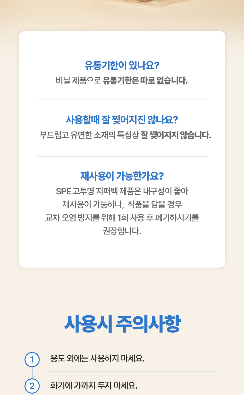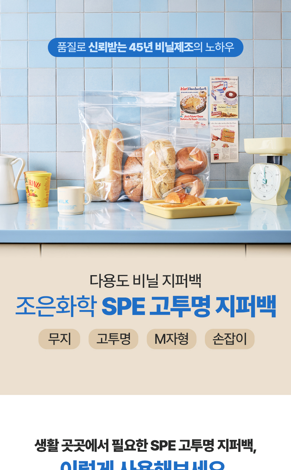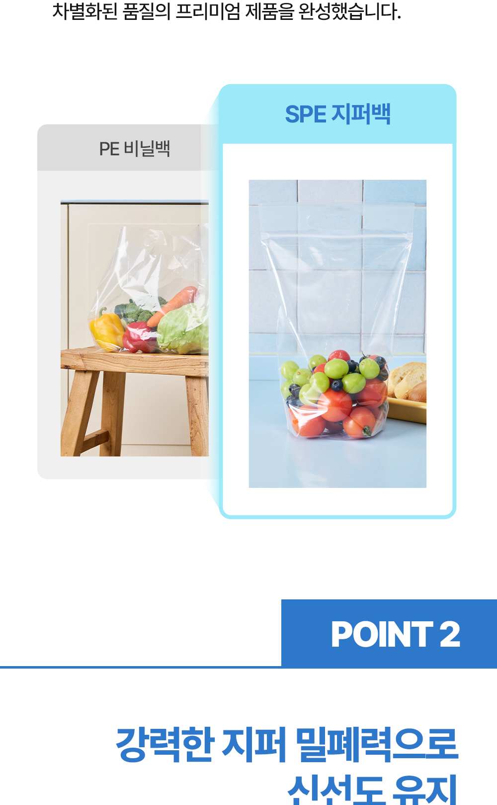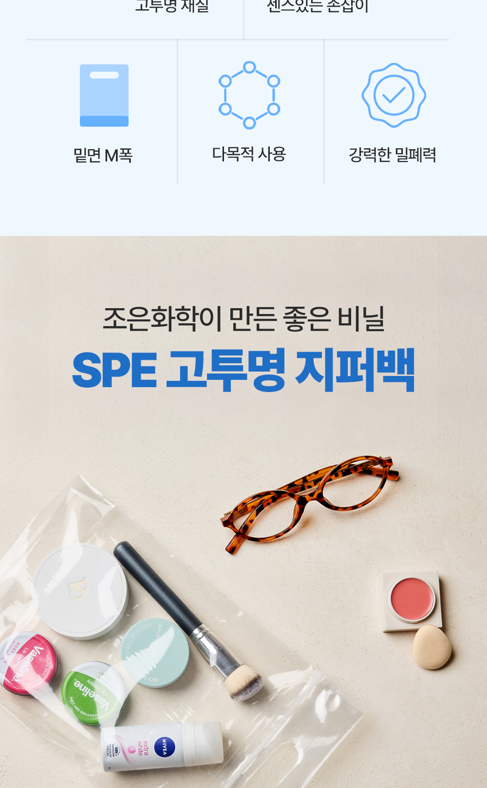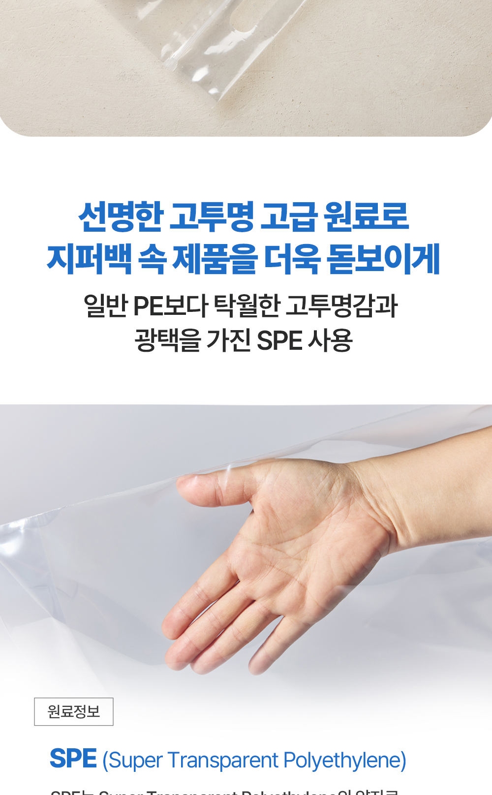 • 소개 SPE 고투명 지퍼백은 PE 대비 원가가 높은 고급 SPE 원료를 사용해 제작된 프리미엄 지퍼백으로,