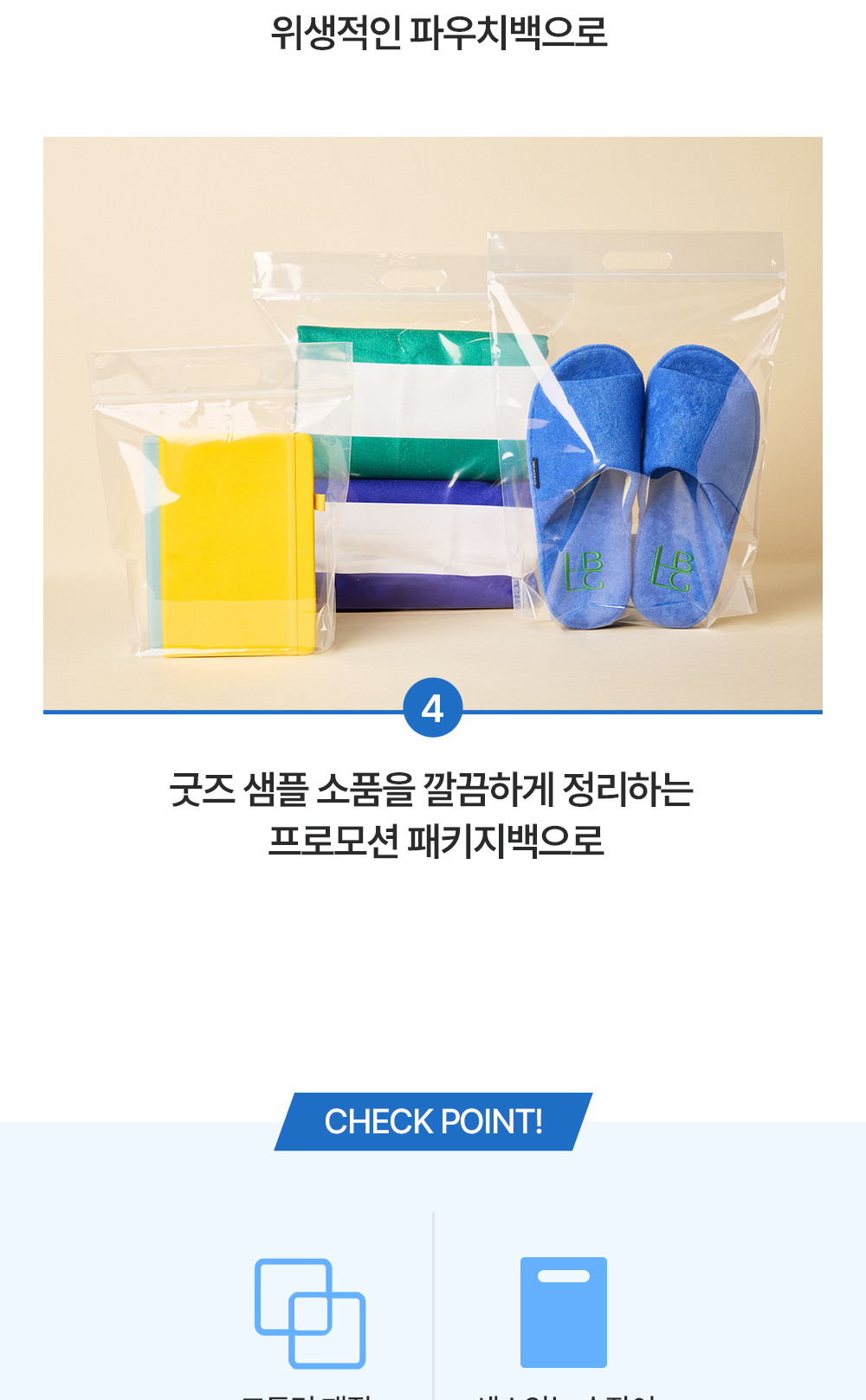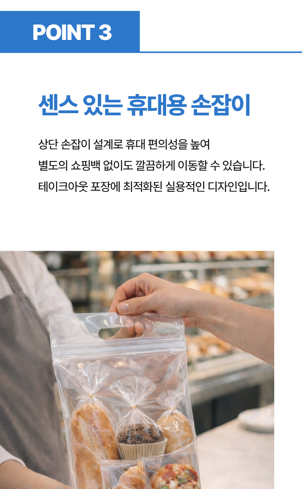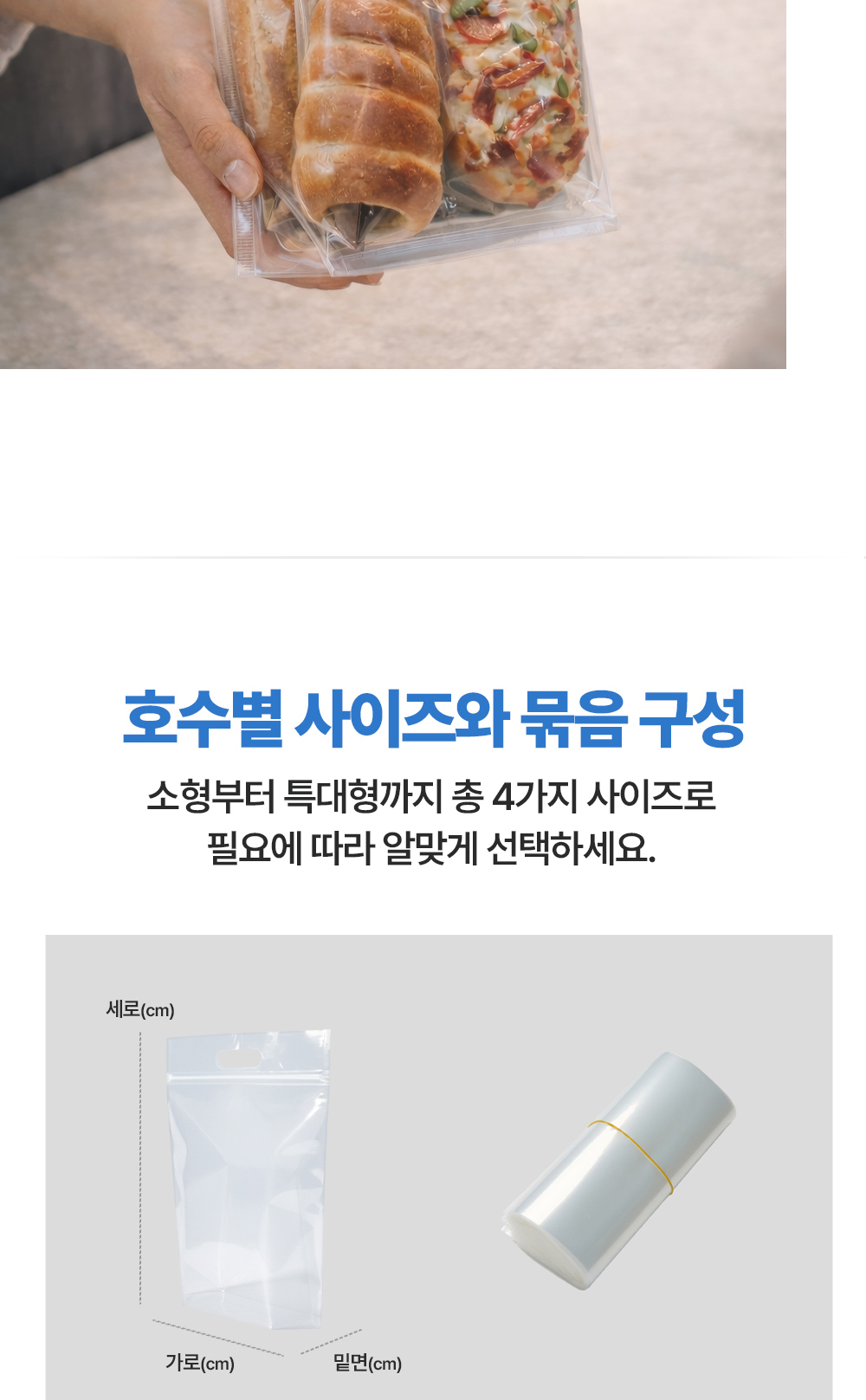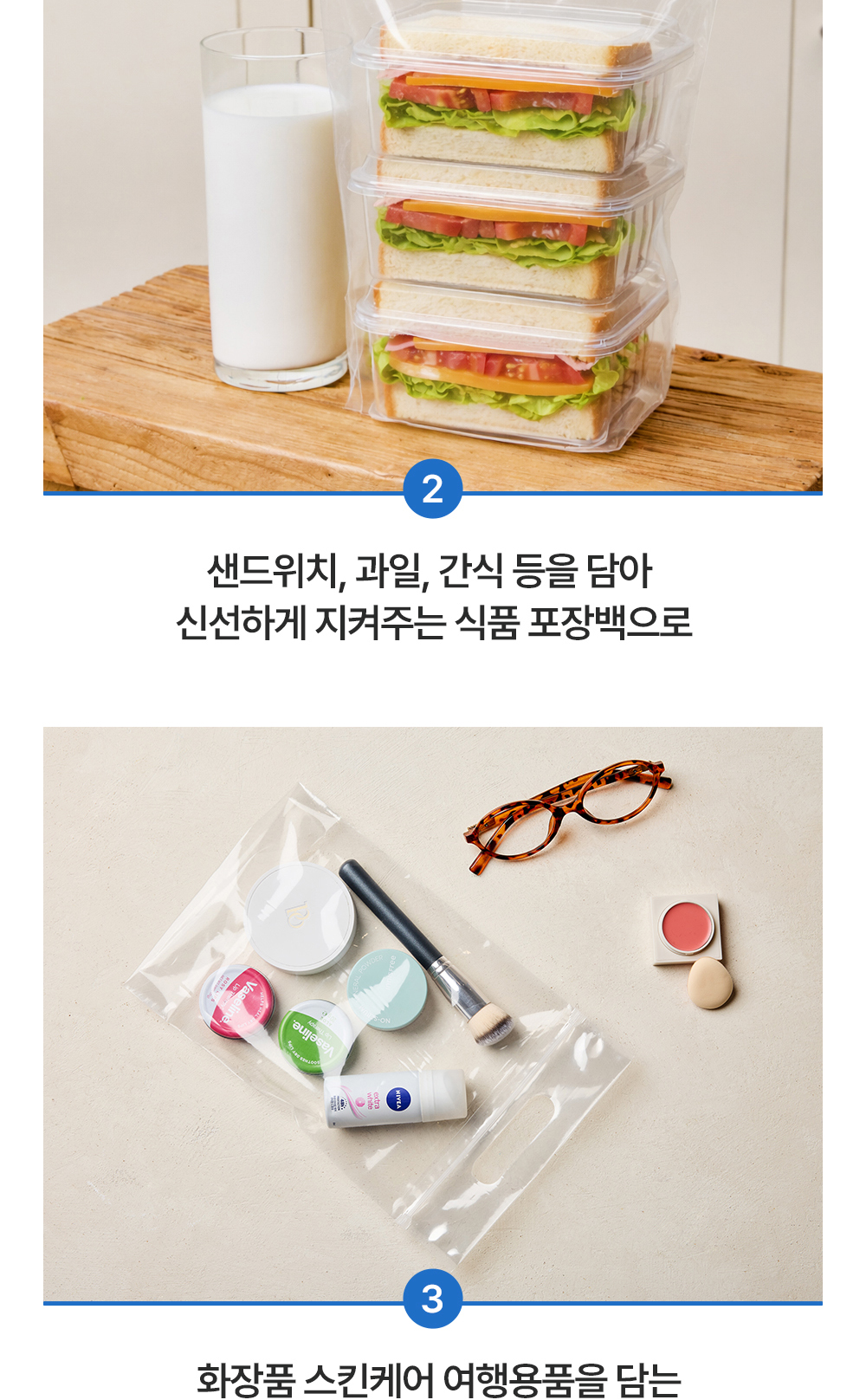 고투명의 제품으로 내용물이 더욱 또렷하게 보여 식품 포장은 물론 위생적인 파우치백, 프로모션 패키지백, 잡화 보관용 등 다양한 용도로 활용할 수 있습니다.