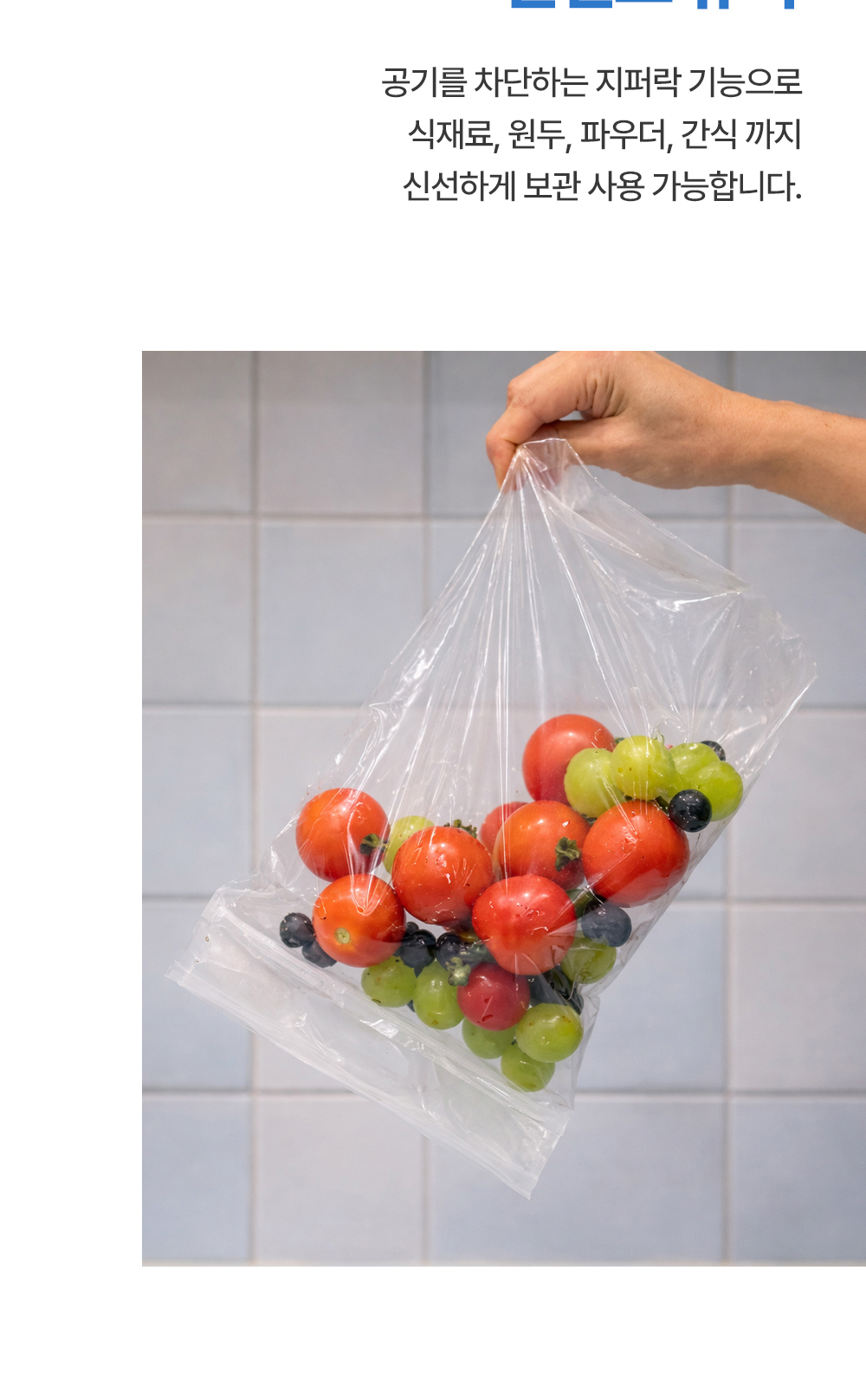 강력한 밀폐력의 지퍼락 기능으로 외부 공기를 효과적으로 차단하여 샌드위치·간식 등 밀봉 포장된 식품을 내용물 흘림 없이 신선하게 보관할 수 있습니다.